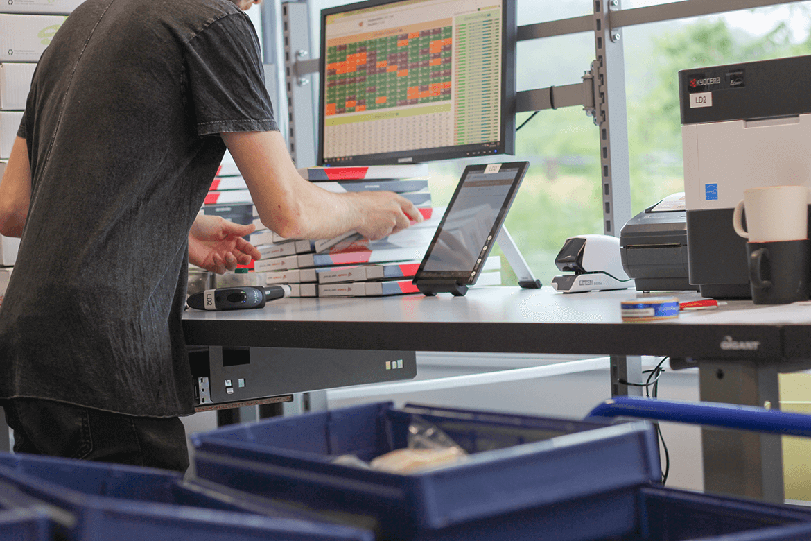 Varje hyllplats är uppmärkt med med en streckkod som måste skannas innan produkterna placeras i lådan. Detta för att säkerställa att rätt saker läggs i rätt låda.
